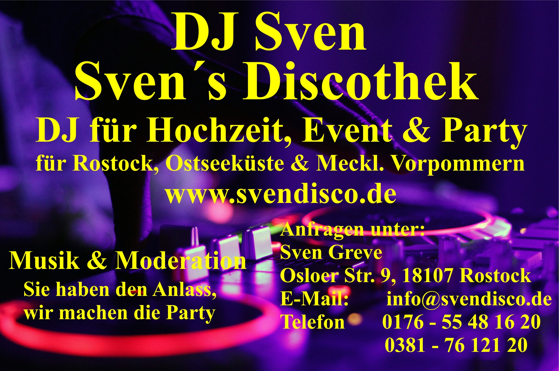 DJ Sven ist ein erfahrener Discjockey, der seit vielen Jahren in Mecklenburg Vorpommern im DJ-Entertainment tätig ist, mit professioneller Veranstaltungstechnik für Ihre Hochzeit, exklusive Party, Firmenevent oder Geburtstagsparty.